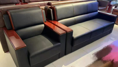 办公沙发、浅胡桃色扶手,仿皮材质